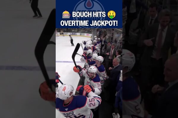 Edmonton Oilers defenseman Evan Bouchard fires a wrist shot past Golden Knights goalie Adin Hill for the overtime winner in